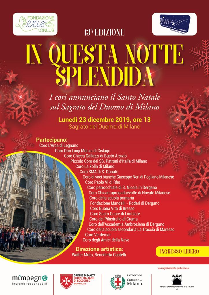 la realizzazione della manifestazione “In questa notte splendida”, dove una ventina di cori e diversi cantanti e musicisti annunceranno il Santo Natale con i canti della tradizione natalizia il 23 dicembre 2019 (inizio manifestazione alle 13, conclusione alle 14.15) , vede la necessità di un significativo gruppo di volontari per la gestione degli allestimenti e delle aree riservate sul Sagrato del Duomo di Milano.
