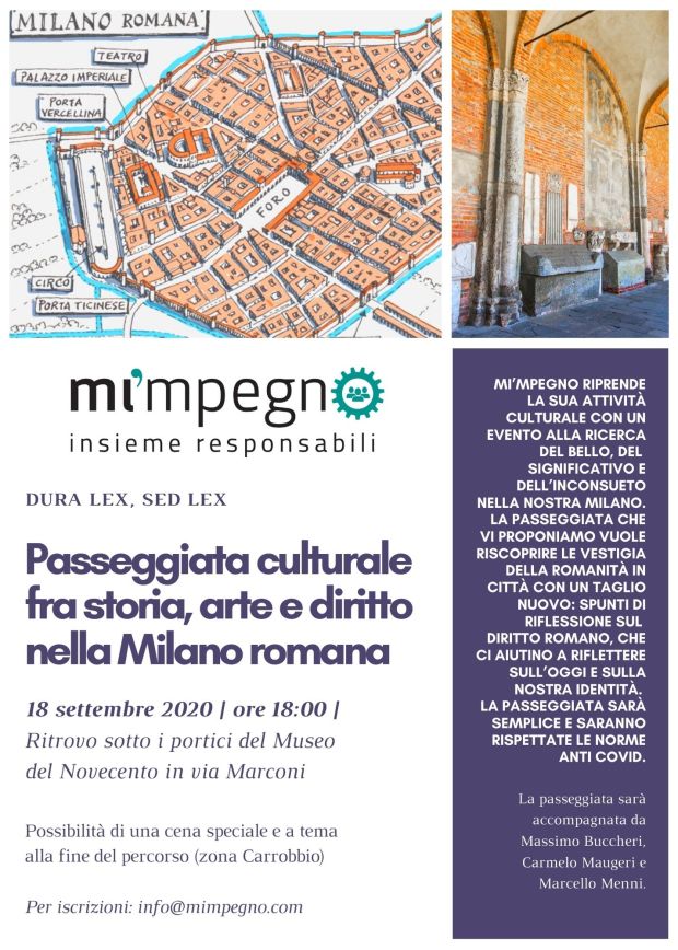 Il 18 settembre alle ore 18 Mi’mpegno vi propone una nuova passeggiata culturale fra storia, arte e diritto nella Milano romana alla riscoperta dell’inconsueto e della bellezza.