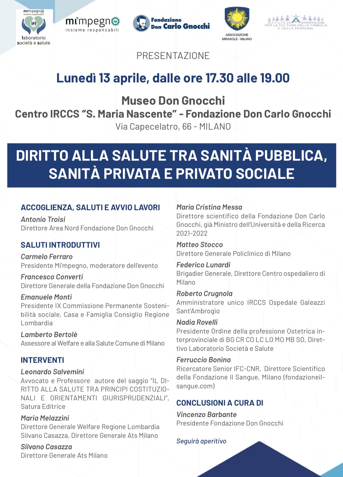 Un momento di altissimo profilo istituzionale e culturale, straordinario per la qualità e la pluralità delle esperienze coinvolte, che mette a confronto competenze e responsabilità tra sanità pubblica, privata, privato sociale e ambito militare.